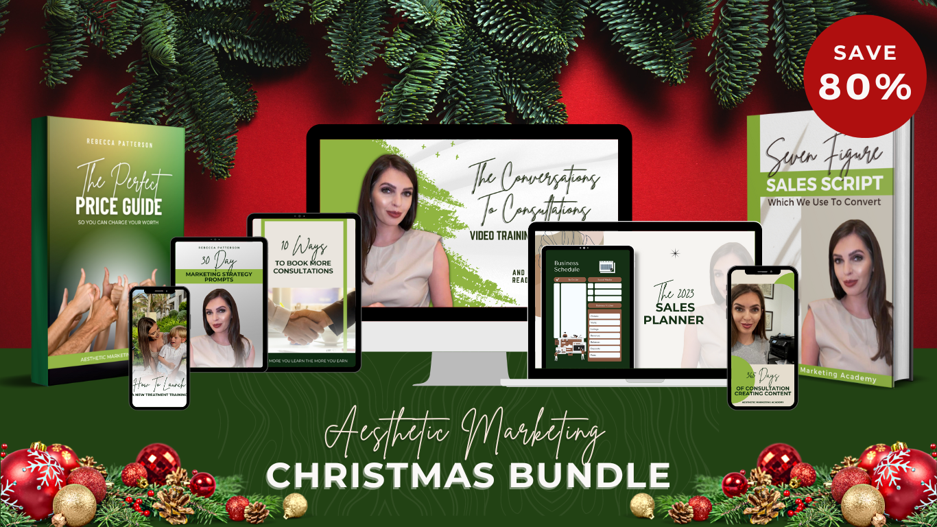Your Christmas list isnāt too long this year but there is one thing that would be a priceless gift to yourself and your business. And that is our aesthetic marketing Christmas bundle. This bundle is absolutely bursting at the seams with knowledge and value that it took me years to figure out. Inside you will find everything a clinic owner needs to end 2023 on a high and make 2024 your best year yet.